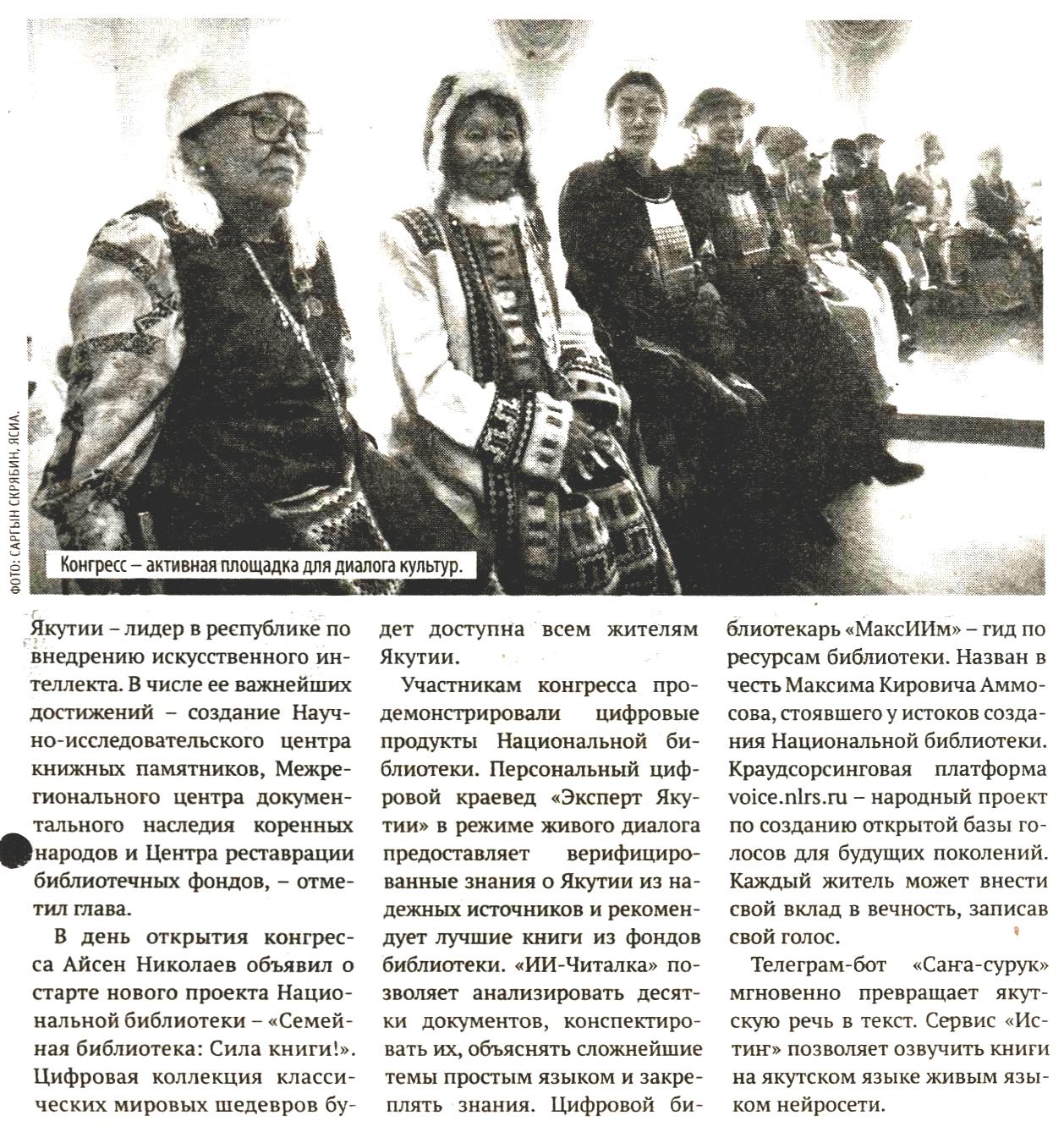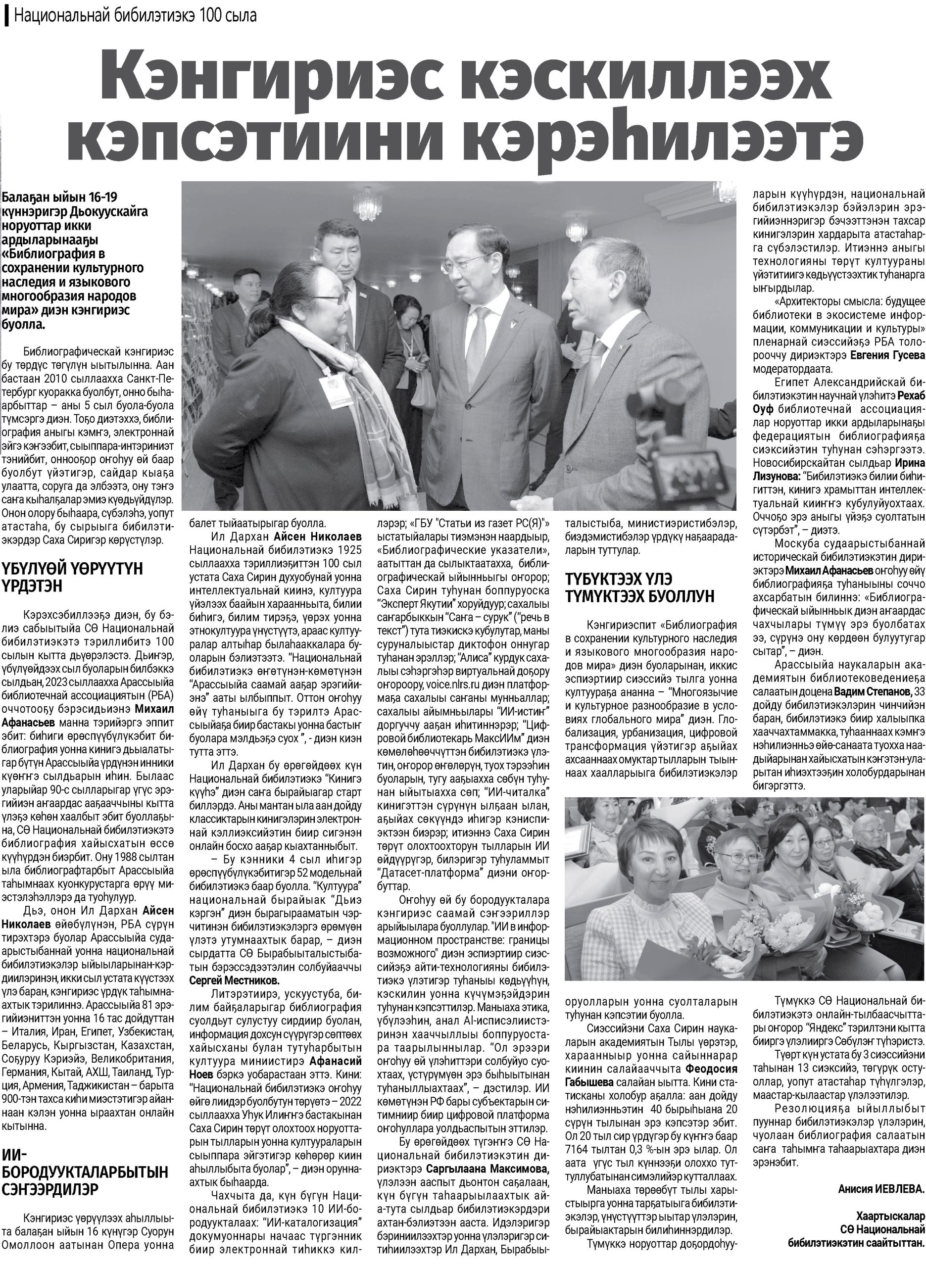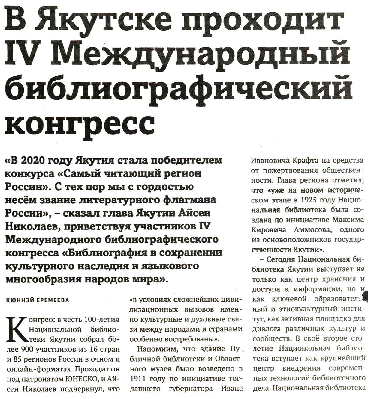 «В 2020 году Якутия стала победителем конкурса «Самый читающий регион России. С тех пор мы с гордостью несём звание литературного флагмана России», – сказал Глава Якутии Айсен Николаев, приветствуя участников IV Международного библиографического конгресса «Библиография в сохранении культурного наследия и языкового многообразия народов мира».