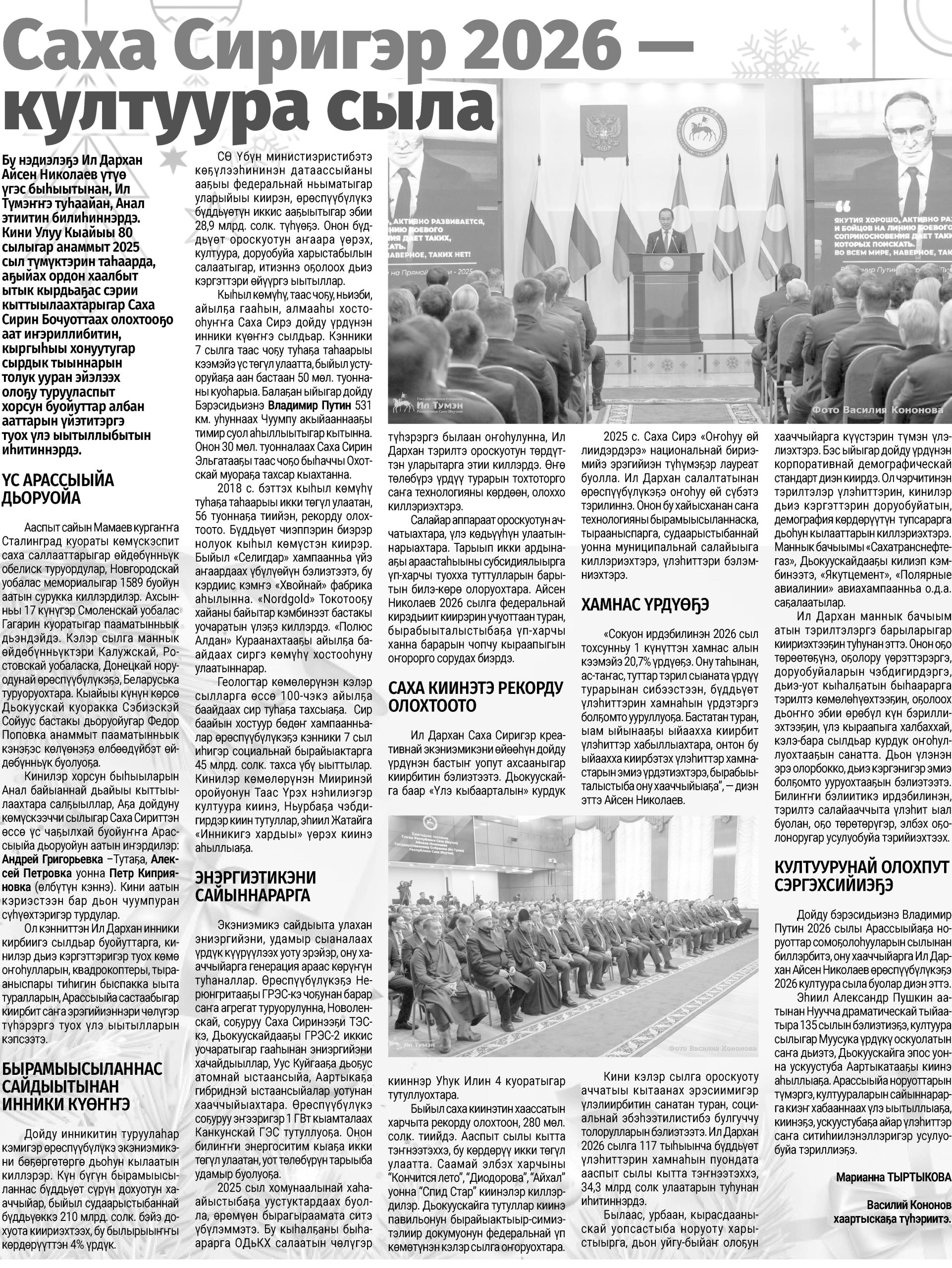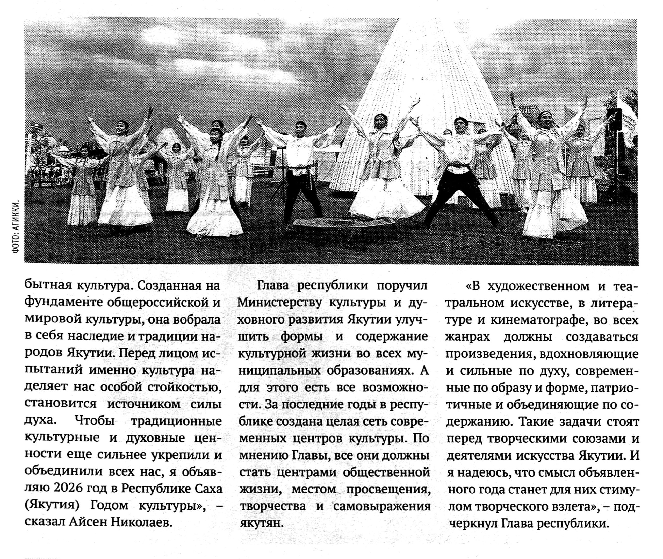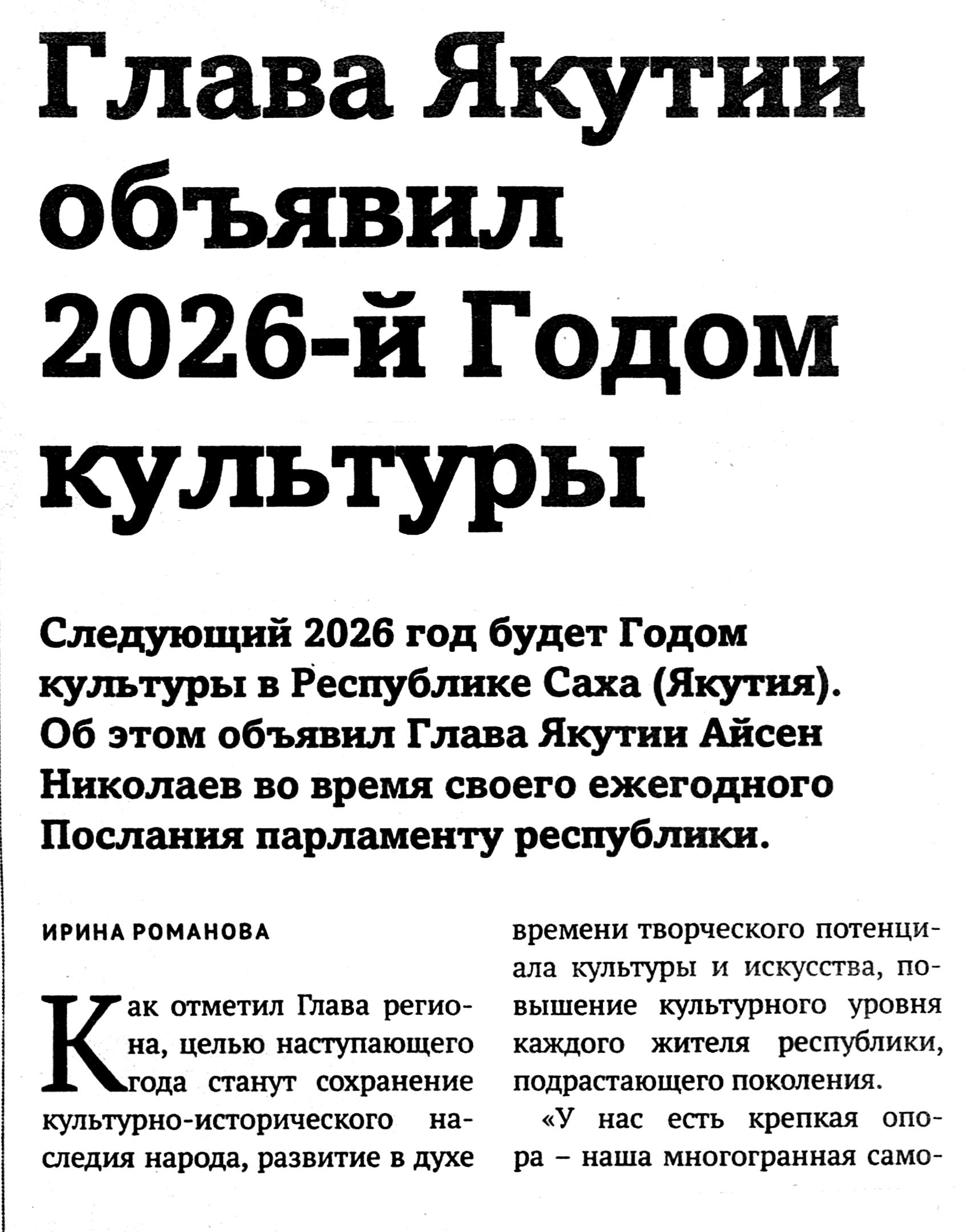 Следующий 2026 год будет Годом культуры в Республике Саха (Якутия). Об этом объявил Глава Якутии Айсен Николаев во время своего ежегодного Послания парламенту республики.