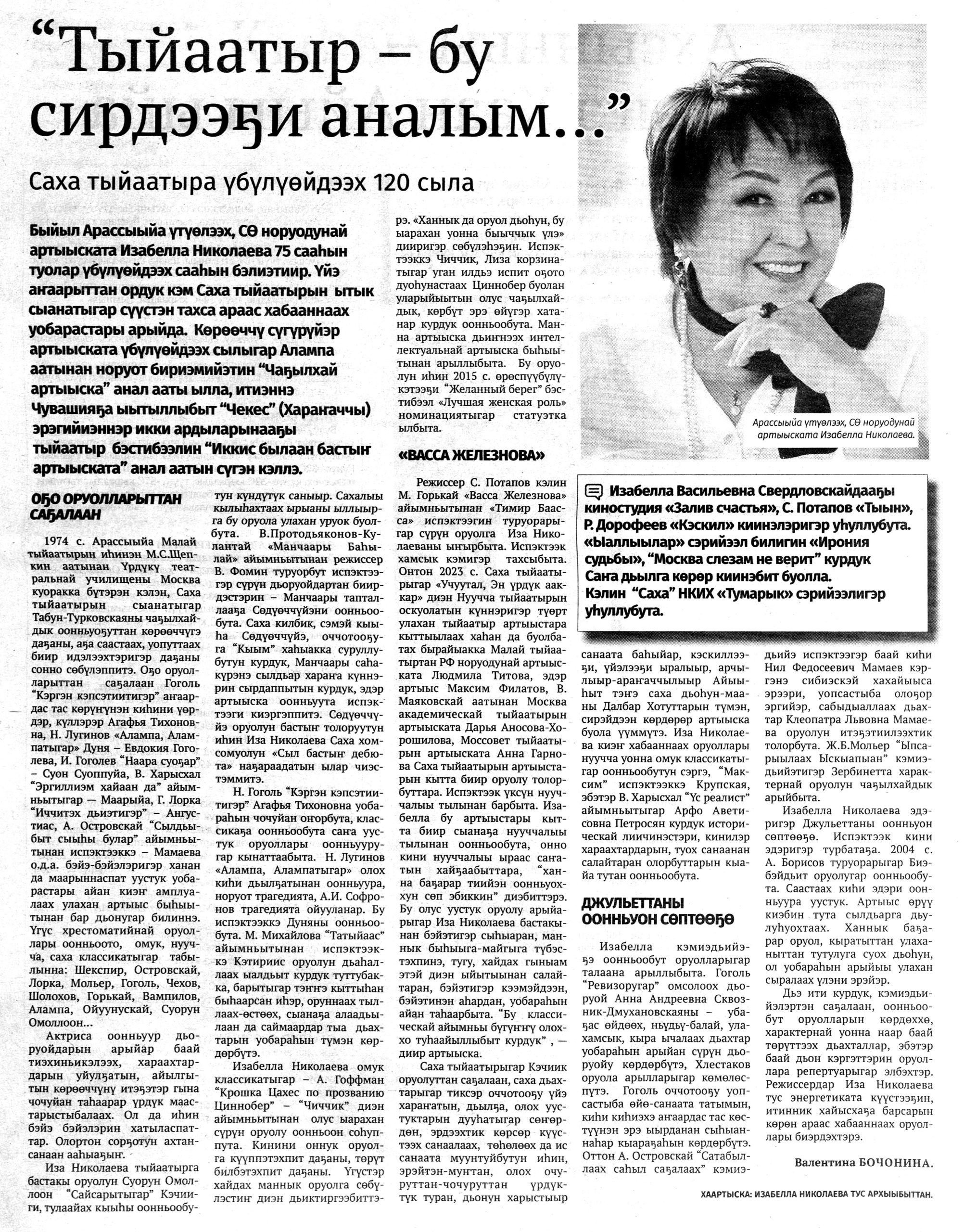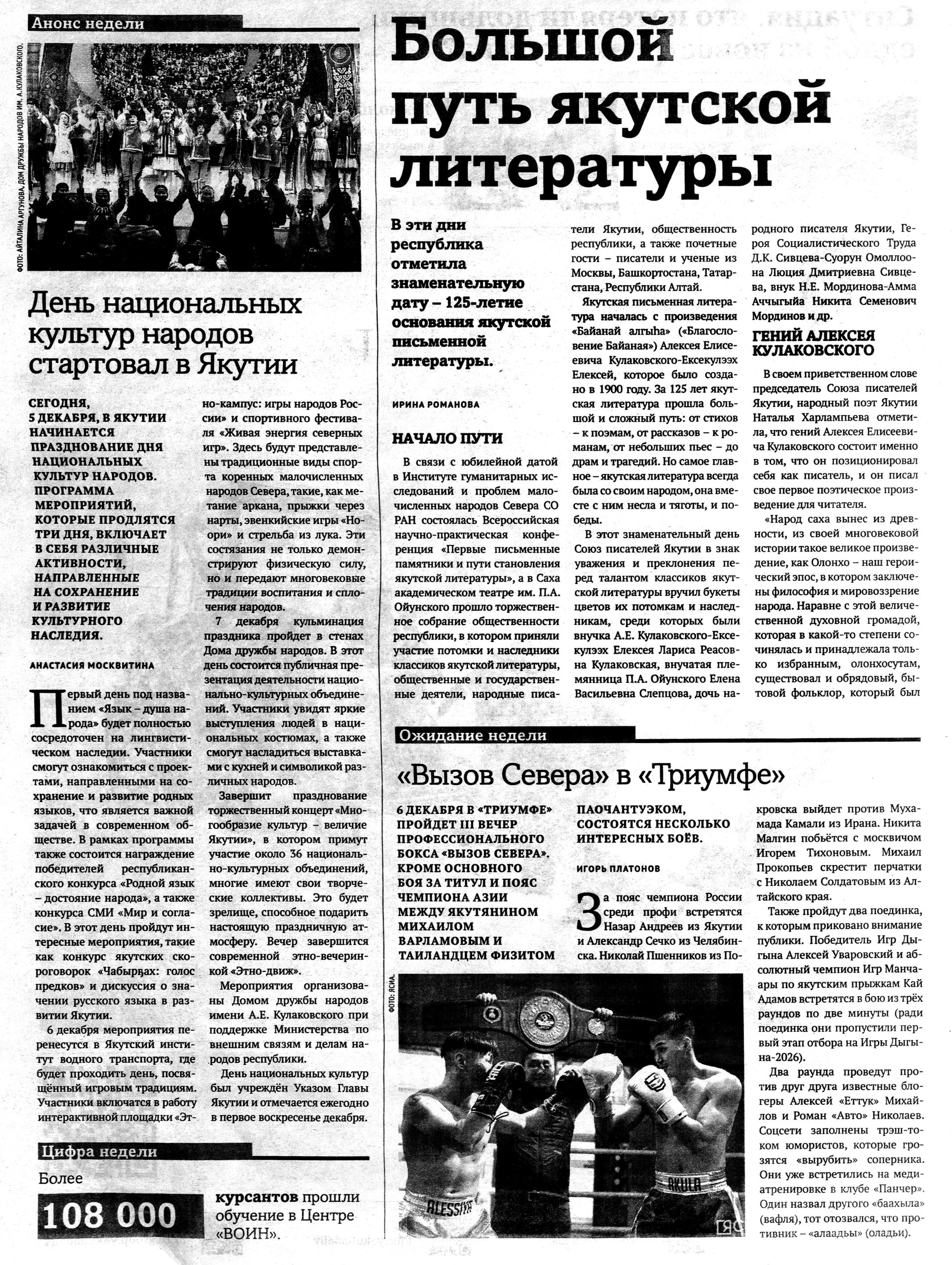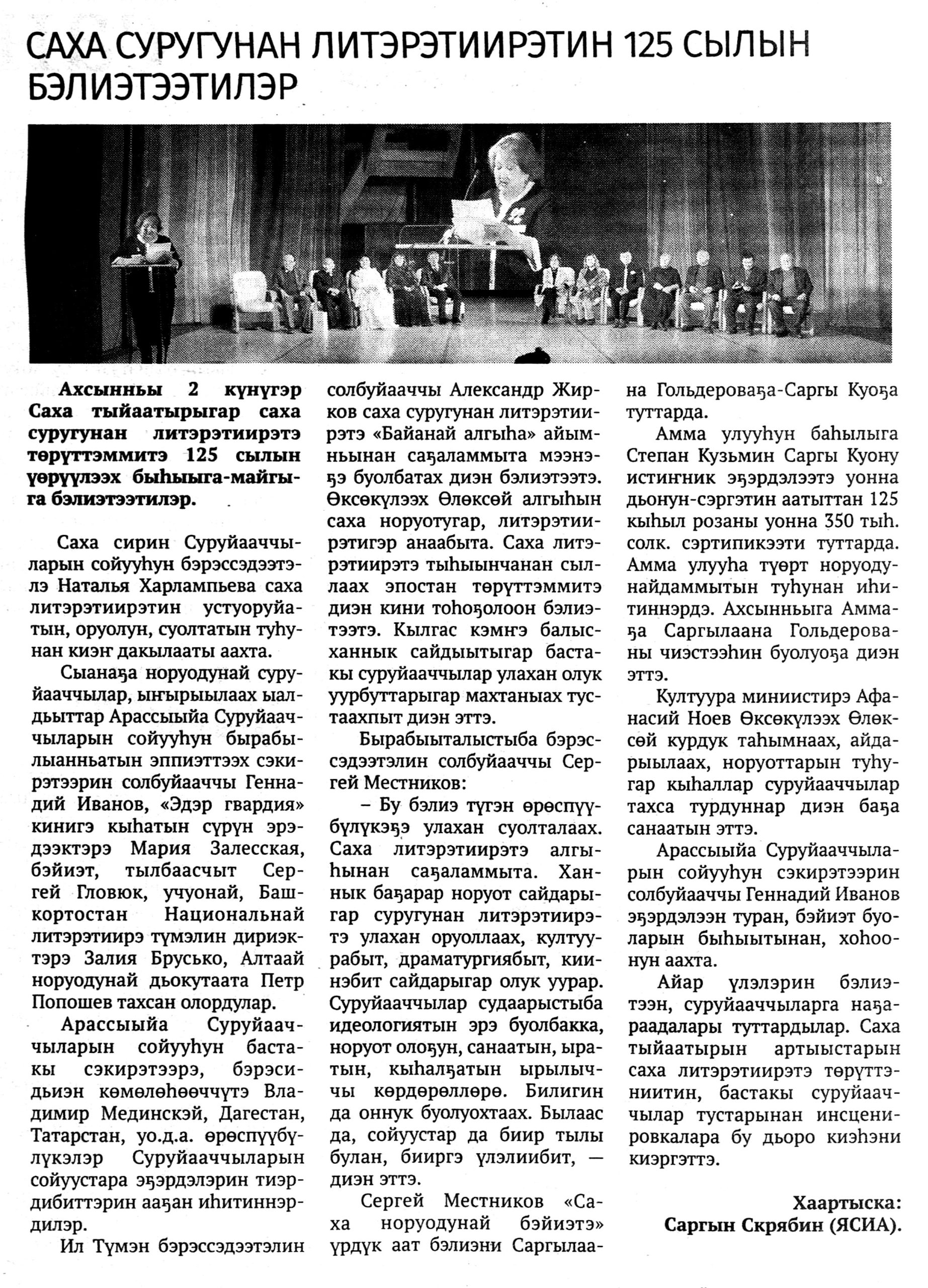 2 декабря в Саха театре состоялось заседание общественности, посвященное 125-летию якутской письменной литературы. Она берет свое начало в стихотворении «Благословение Байаная» Алексея Кулаковского. В ходе торжественного вечера отметили лучших писателей и поэтов республики. Присутствовали представители Союза писателей России и Якутии, а также потомки якутских классиков.
