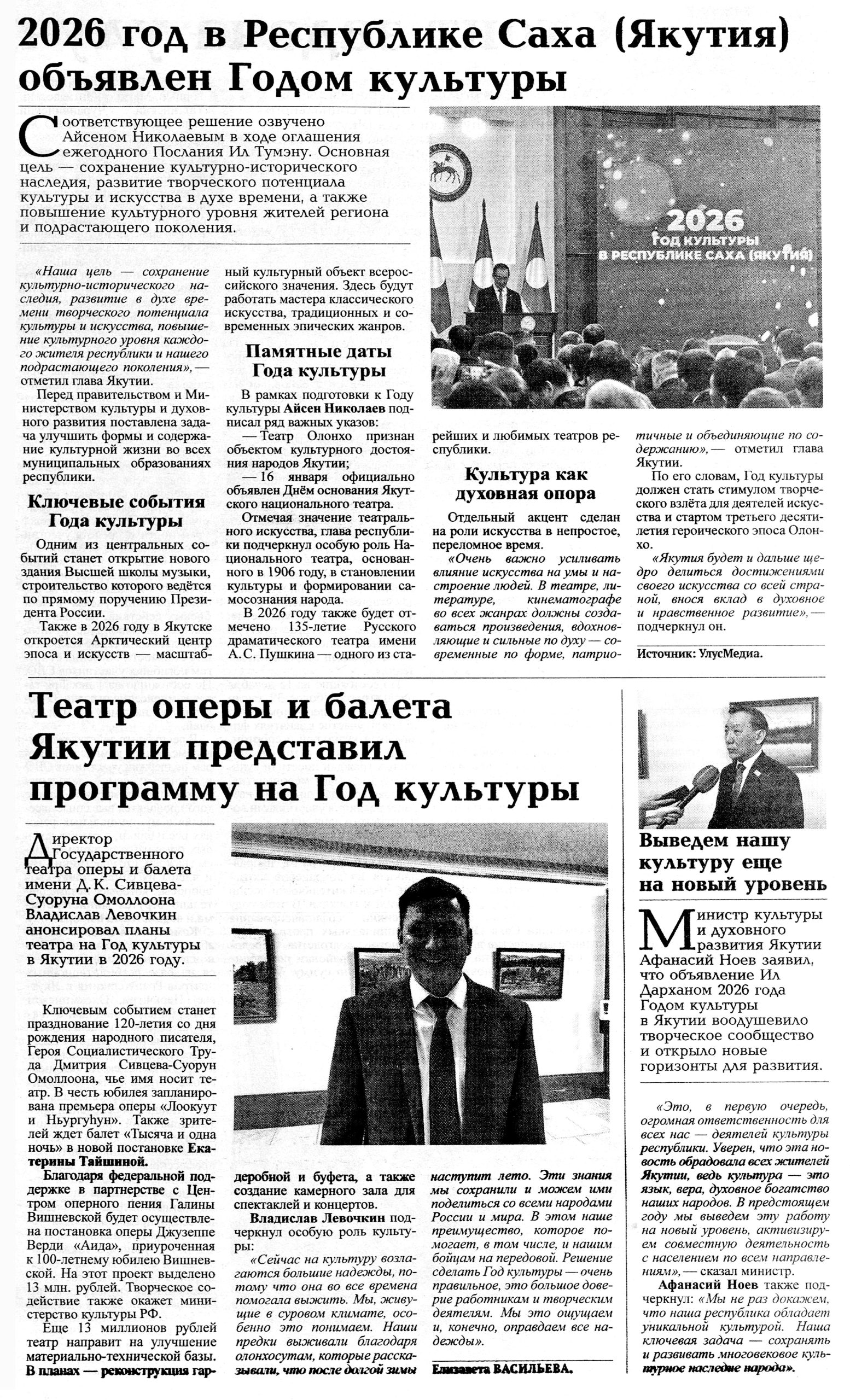Глава Якутии во время ежегодного послания Ил Тумэну 2026 год в республике объявил Годом культуры. Об основных задачах предстоящего года рассказал министр культуры и духовного развития республики Афанасий Ноев.